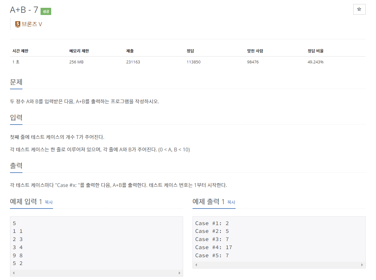 각 테스트 케이스마다 "Case #x: "를 출력한 다음, A+B를 출력한다. 테스트 케이스 번호는 1부터 시작한다.