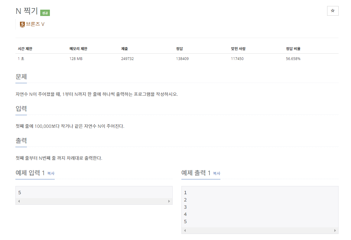 자연수 N이 주어졌을 때, 1부터 N까지 한 줄에 하나씩 출력하는 프로그램을 작성하시오.