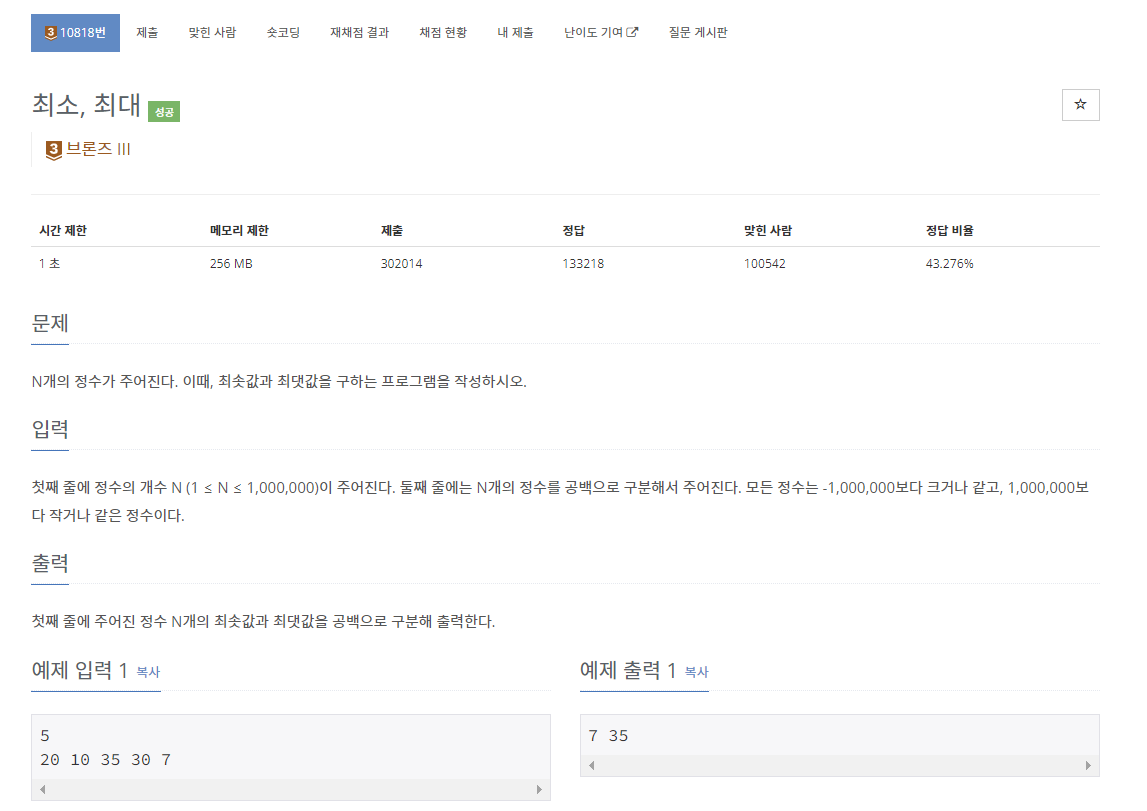 따라서, min과 max를 선언할 때, 갱신이 될 수 있도록 범위 밖의 값인 1000001, -1000001로 초기화시켜야 한다.
