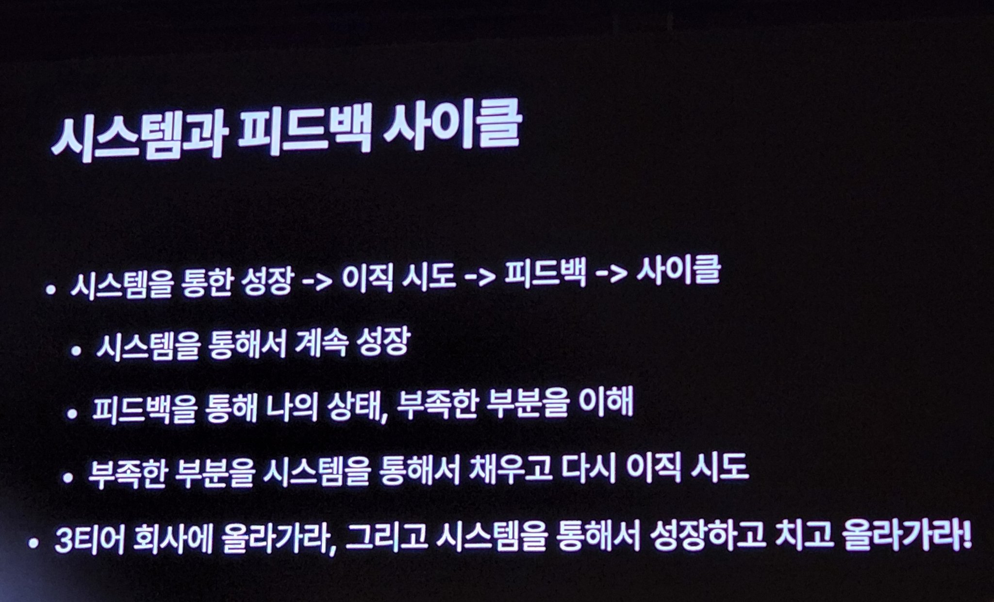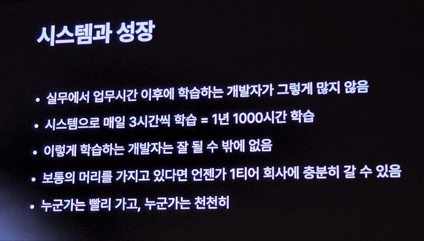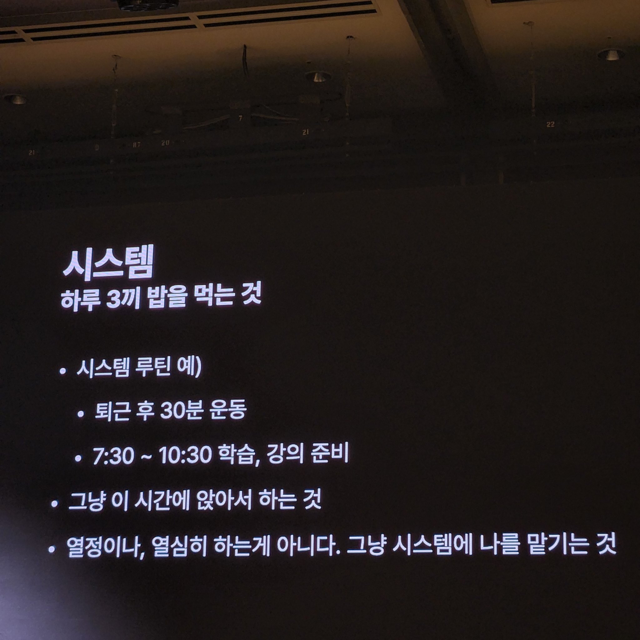 특히, 강연 내용 중 시스템에 관한 이야기가 기억에 남습니다. 하루에 3끼 밥을 먹는 것처럼, 공부의 시스템을 구축하여 꾸준히 하는 것이 핵심이라고 하셨습니다. 저는 열정이 과해서 종종 프로젝트나 과제를 하다 번아웃이 오는 경우가 있었는데, 머리를 비우고 책상에 앉아 개발 공부를 편히 시작할 수 있도록, 나의 시스템, 루틴을 만들어야겠다고 다짐했습니다.