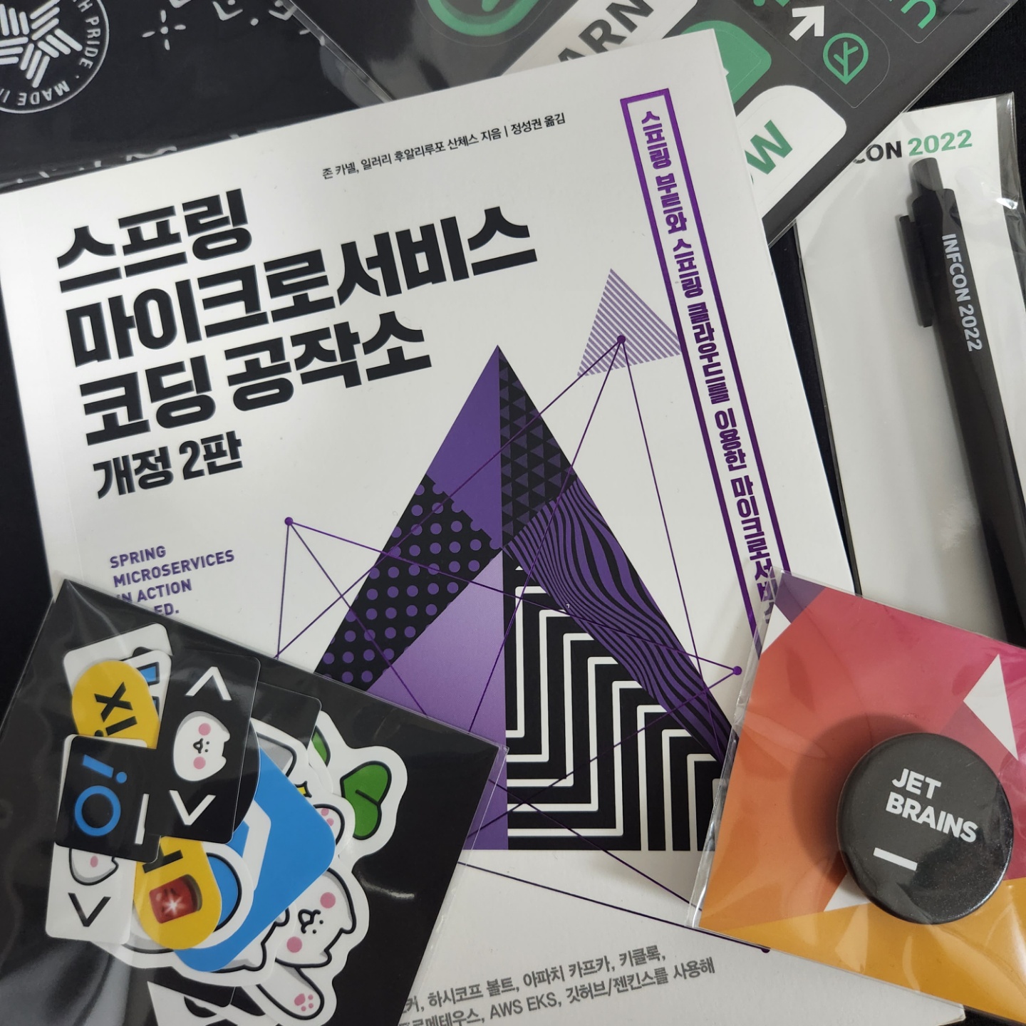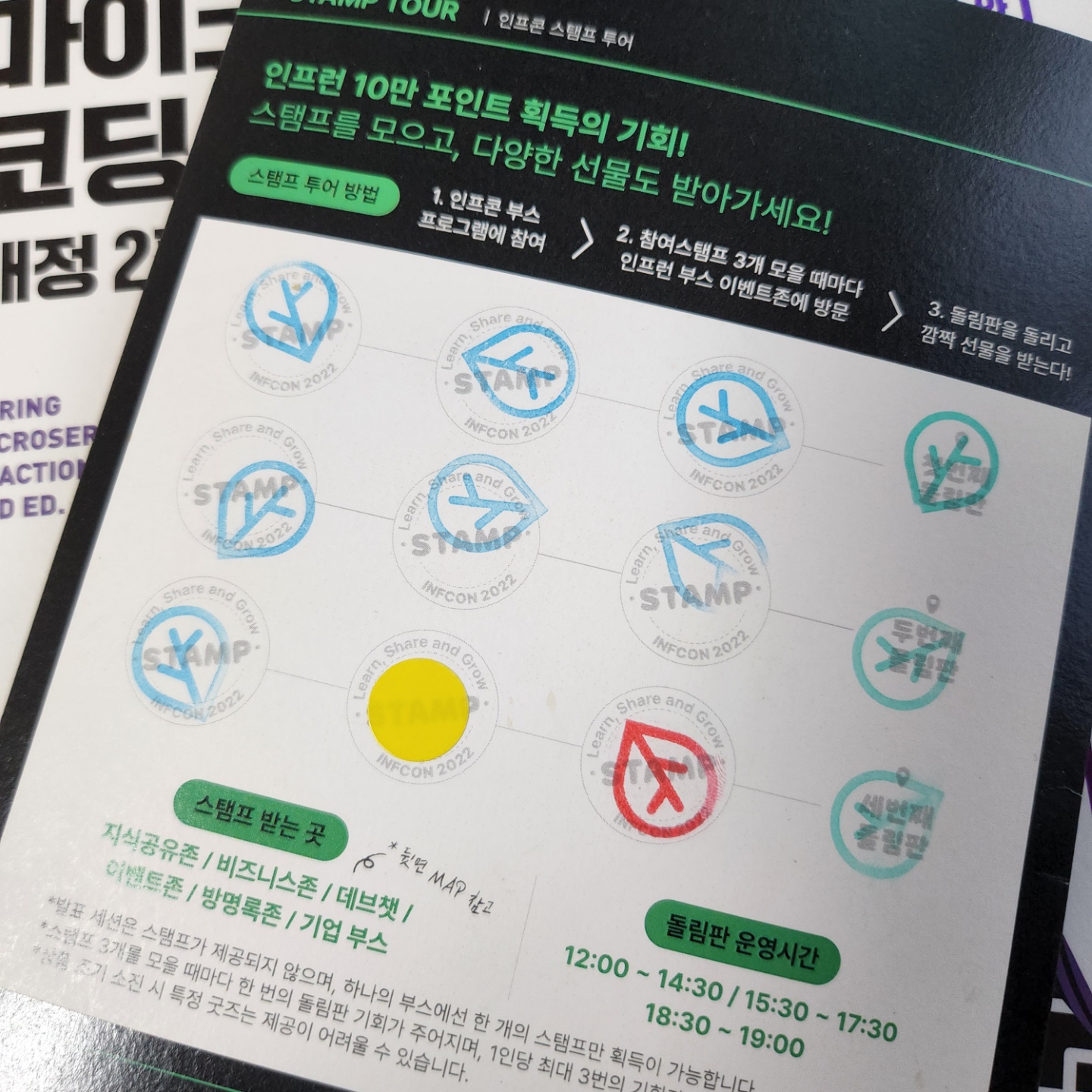 인프콘에는 방명록존, 지식공유존, 비즈니스존, 이벤트존, 기업부스에서 스탬프를 받을 수 있었습니다. 세 개의 도장을 모을 때마다 스탬프를 받을 수 있었으며, 저는 책 '스프링 마이크로소프트 코딩 공작소'와 인프런 반팔티, 간식을 받았습니다! 요즘, 스프링에 관심을 가지고 공부 중인데 인프콘을 통해 유익한 세션도 듣고, 책도 받아 무척 행복했습니다.😊