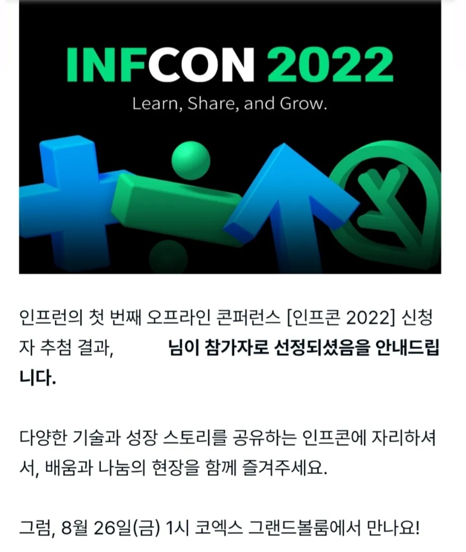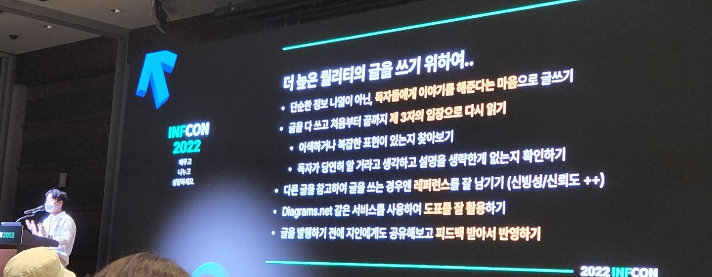 안녕하세요 지구입니다! 며칠 전 2022년 8월 26일에 코엑스에서 열린 INFCON에 참가자로 선정되어 생애 첫 컨퍼런스를 즐기고 왔습니다. 다양한 기업 부스, 이벤트 부스와 세션을 통해 많은 것을 보고 느꼈습니다. 오늘은 인프콘 세션 후기를 남겨보고자 합니다.