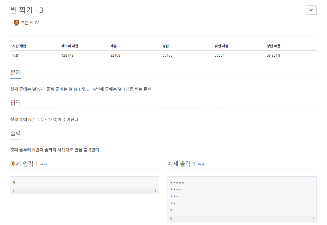 첫째 줄에는 별 N개, 둘째 줄에는 별 N-1개, ..., N번째 줄에는 별 1개를 찍는 문제