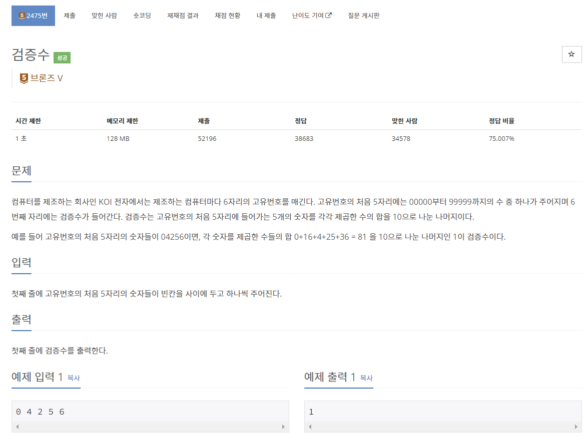 컴퓨터를 제조하는 회사인 KOI 전자에서는 제조하는 컴퓨터마다 6자리의 고유번호를 매긴다. 고유번호의 처음 5자리에는 00000부터 99999까지의 수 중 하나가 주어지며 6번째 자리에는 검증수가 들