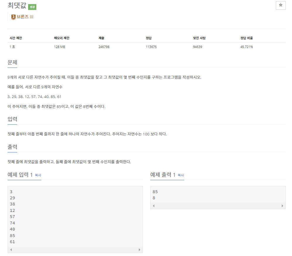 9개의 서로 다른 자연수가 주어질 때, 이들 중 최댓값을 찾고 그 최댓값이 몇 번째 수인지를 구하는 프로그램을 작성하시오. 예를 들어, 서로 다른 9개의 자연수 3, 29, 38, 12, 57, 74, 40, 85, 61 이 주어