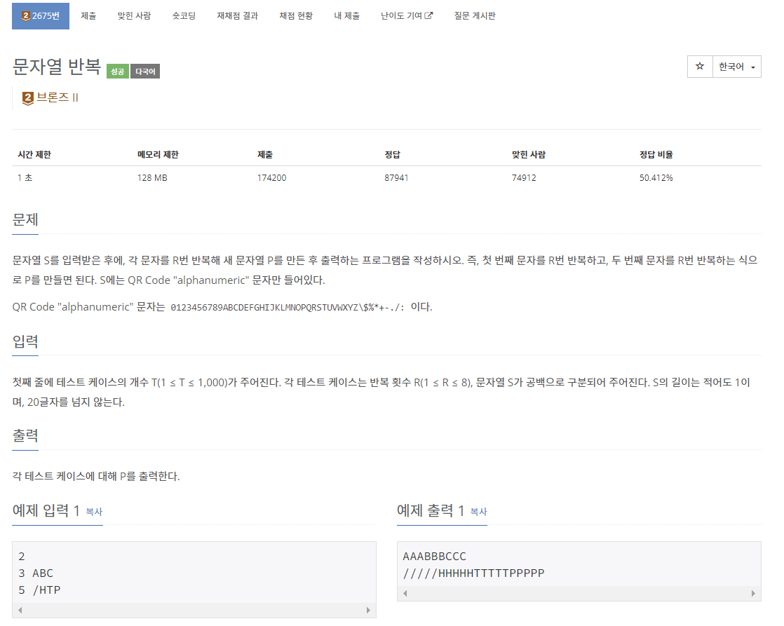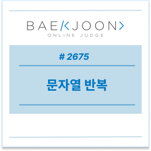 두 번째 for문에서는 문자열 S의 길이만큼 연산을 반복하고, 세 번째 for문에서 정수 R만큼 연산을 반복해, 결과값을 출력한다.