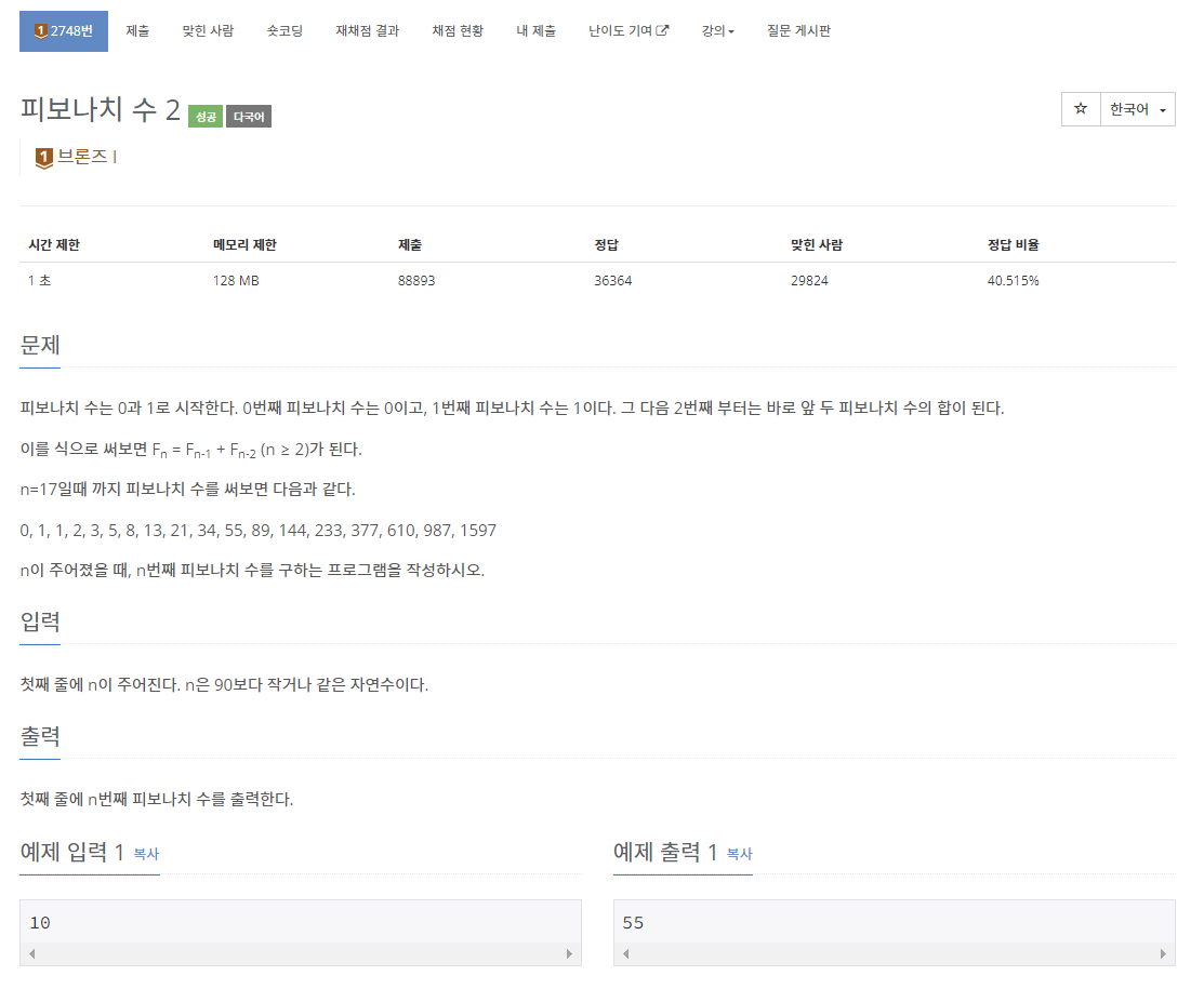 문제 풀이 다이내믹 프로그래밍(DP)를 이용해 문제를 해결했다. n이 조건의 최댓값인 45인 경우, 피보나치 수는 11,3490,3170이다. int 형의 범위는 -2,147,483,648 ~ 2,147,483,647이므로, 피보나치 수의 최댓