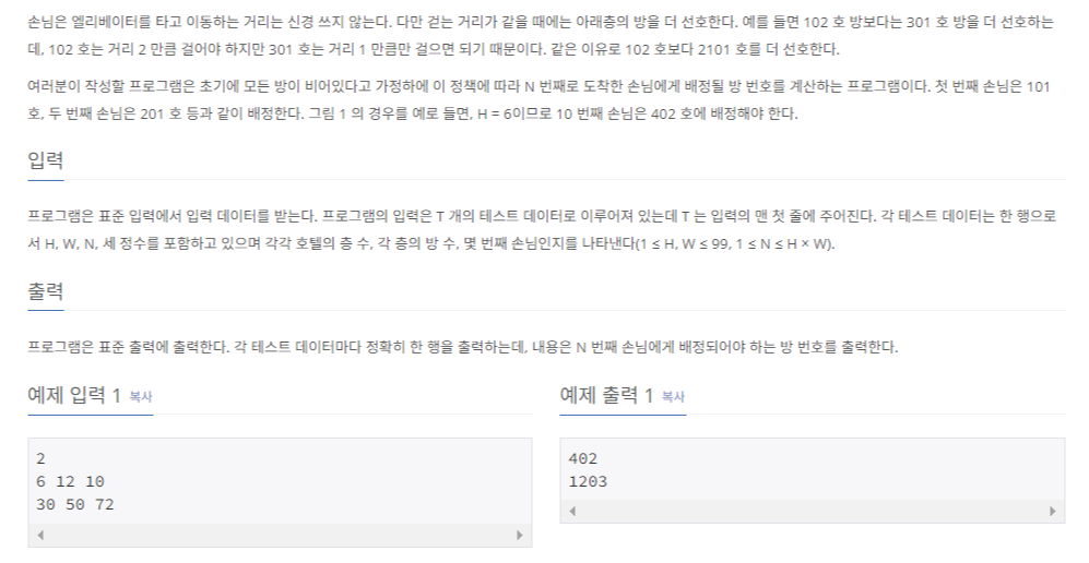 각각 호텔의 층 수, 각 층의 방 수, 몇 번째 손님을 H, W, N으로 입력받는다.