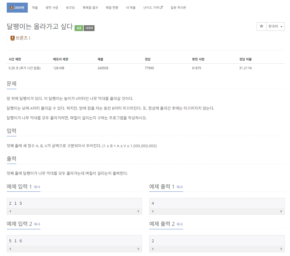 else if ((V - A) % (A - B) != 0) { // 나머지 != 0이라면, (A-B)만큼 한 번더 올라간 후 A보다 작은 높이가 남은 것이므로 +2