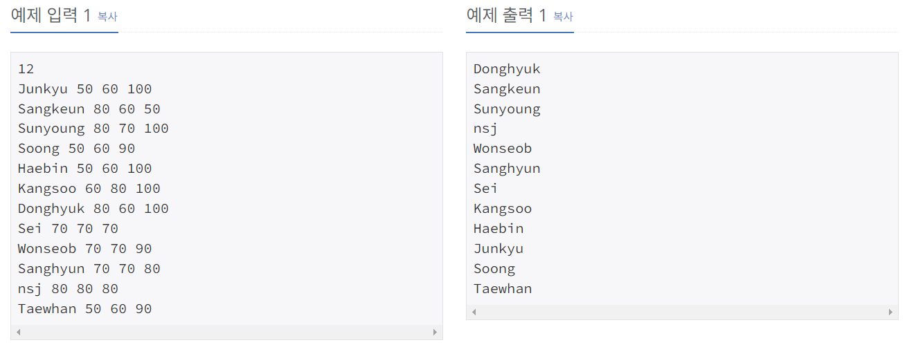 첫째 줄에 도현이네 반의 학생의 수 N (1 ≤ N ≤ 100,000)이 주어진다. 둘째 줄부터 한 줄에 하나씩 각 학생의 이름, 국어, 영어, 수학 점수가 공백으로 구분해 주어진다. 점수는 1보다 크거나 같고, 1