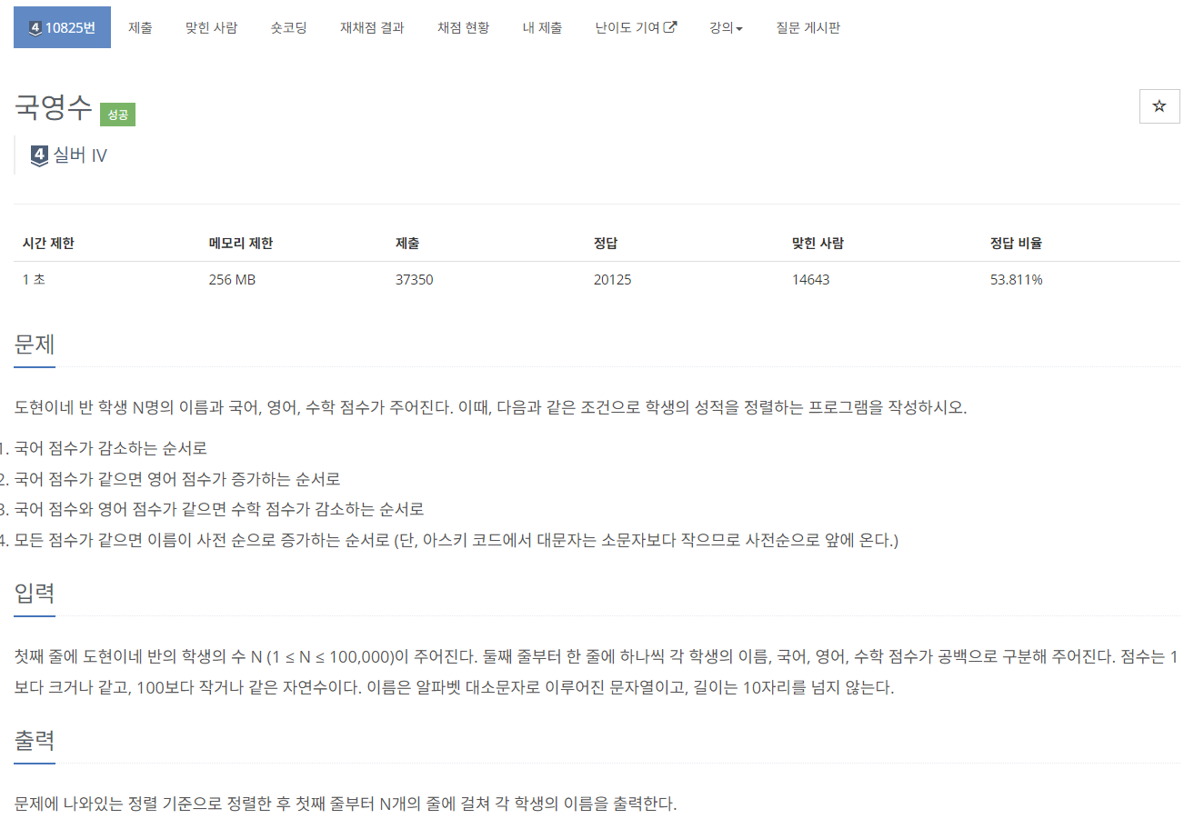 return a.kor > b.kor; // 1. 국어 점수가 감소하는 순서로 (내림차순)