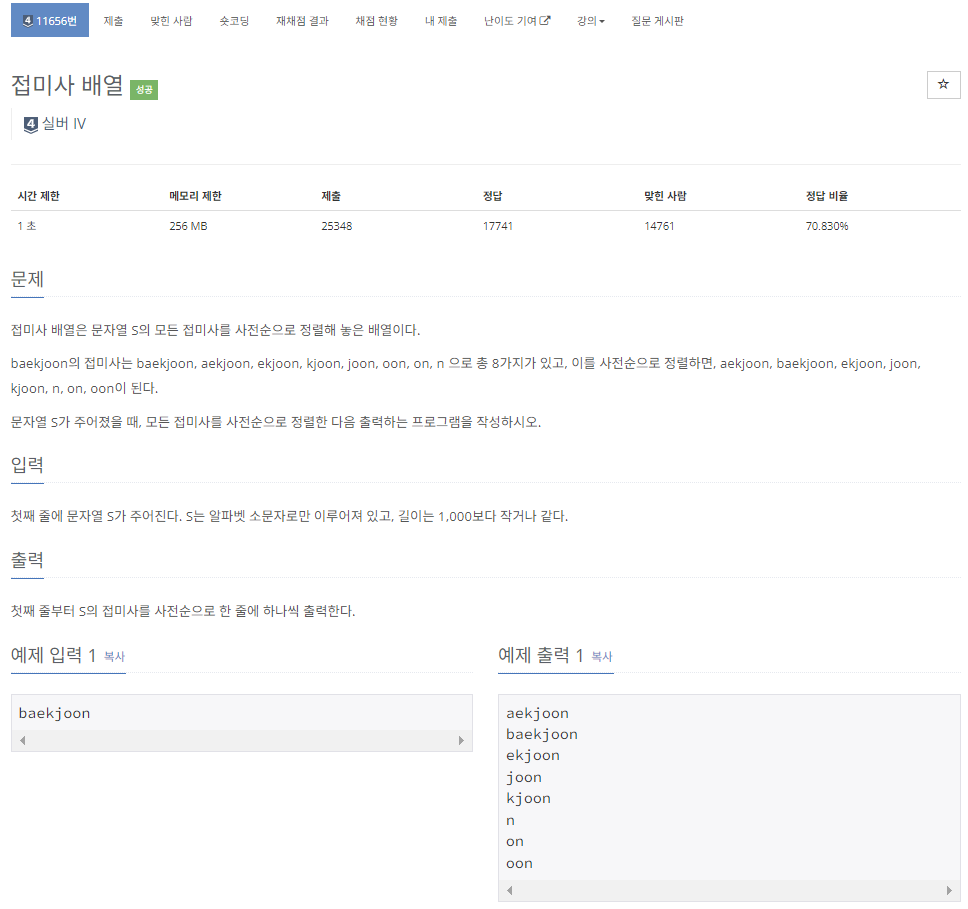 마지막으로, sort() 함수를 이용해 접미사들을 사전 순으로 정렬했다.