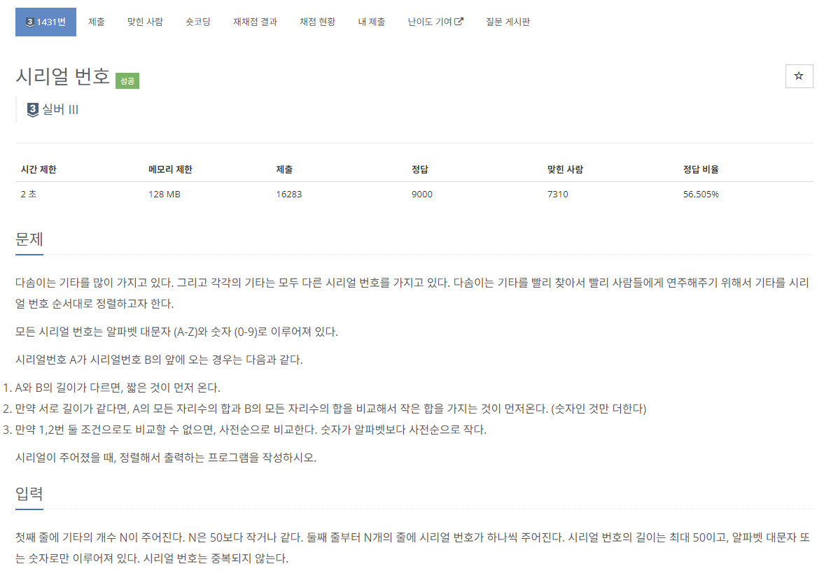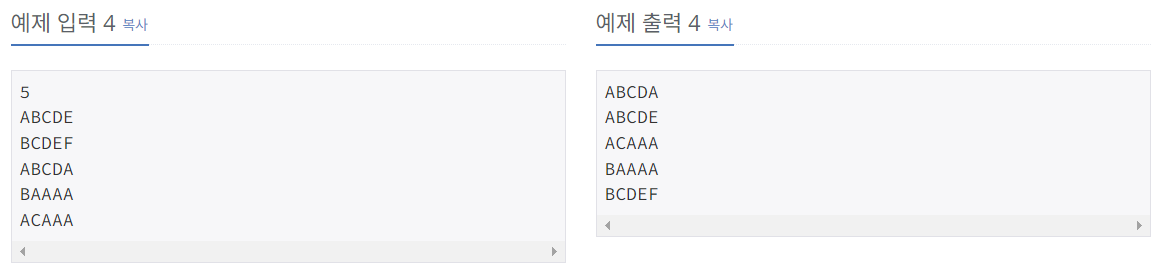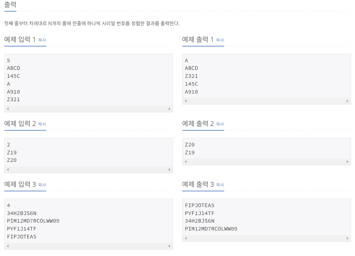 첫째 줄에 기타의 개수 N이 주어진다. N은 50보다 작거나 같다. 둘째 줄부터 N개의 줄에 시리얼 번호가 하나씩 주어진다. 시리얼 번호의 길이는 최대 50이고, 알파벳 대문자 또는 숫자로만 이루어