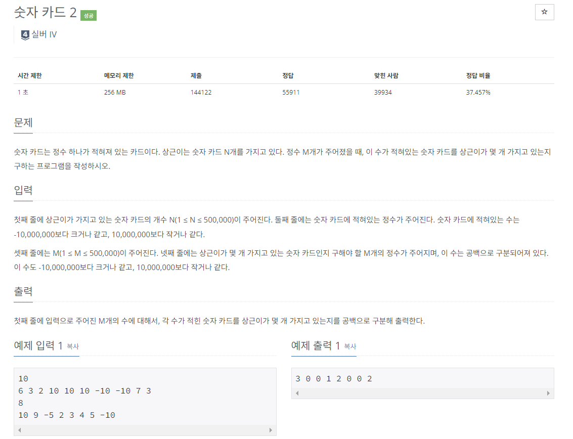 첫째 줄에 상근이가 가지고 있는 숫자 카드의 개수 N(1 ≤ N ≤ 500,000)이 주어진다. 둘째 줄에는 숫자 카드에 적혀있는 정수가 주어진다. 숫자 카드에 적혀있는 수는 -10,000,000보다 크거나 같고, 10,0